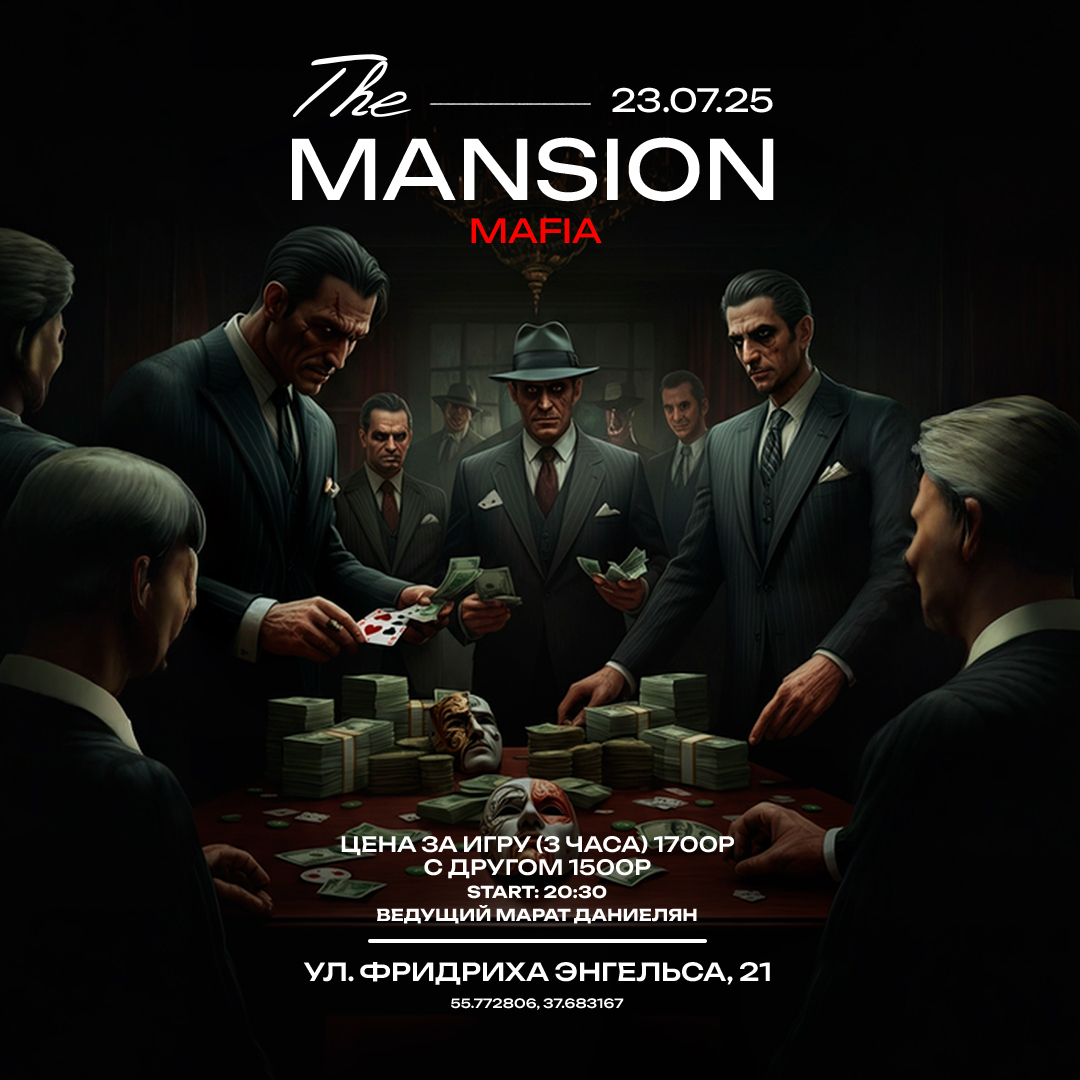 Закрытая мафия в камерной атмосфере. Прячь роли, строй альянсы и выноси приговор за закрытыми дверями особняка. Три часа игры ты не просто игрок – ты часть живого, дышащего заговора. Под масками скрыты мотивы и тайные союзы. Здесь правит не сила, а холодный разум и удачно сыгранная роль. Добро пожаловать в The Mansion – здесь начинается настоящая мафия.